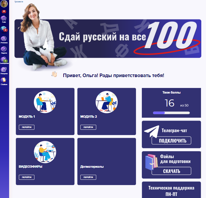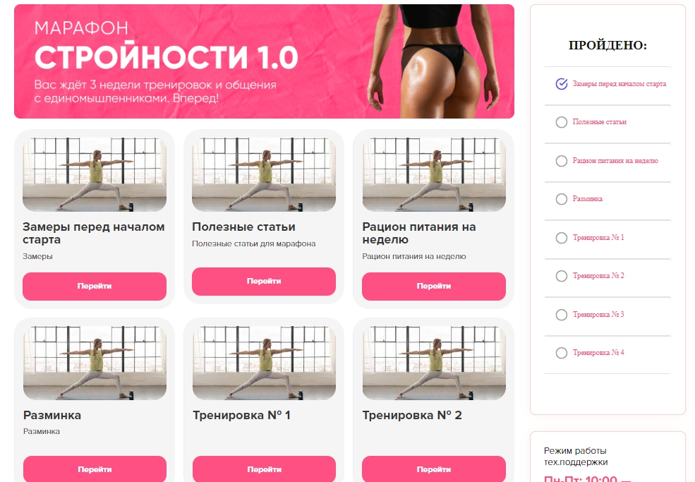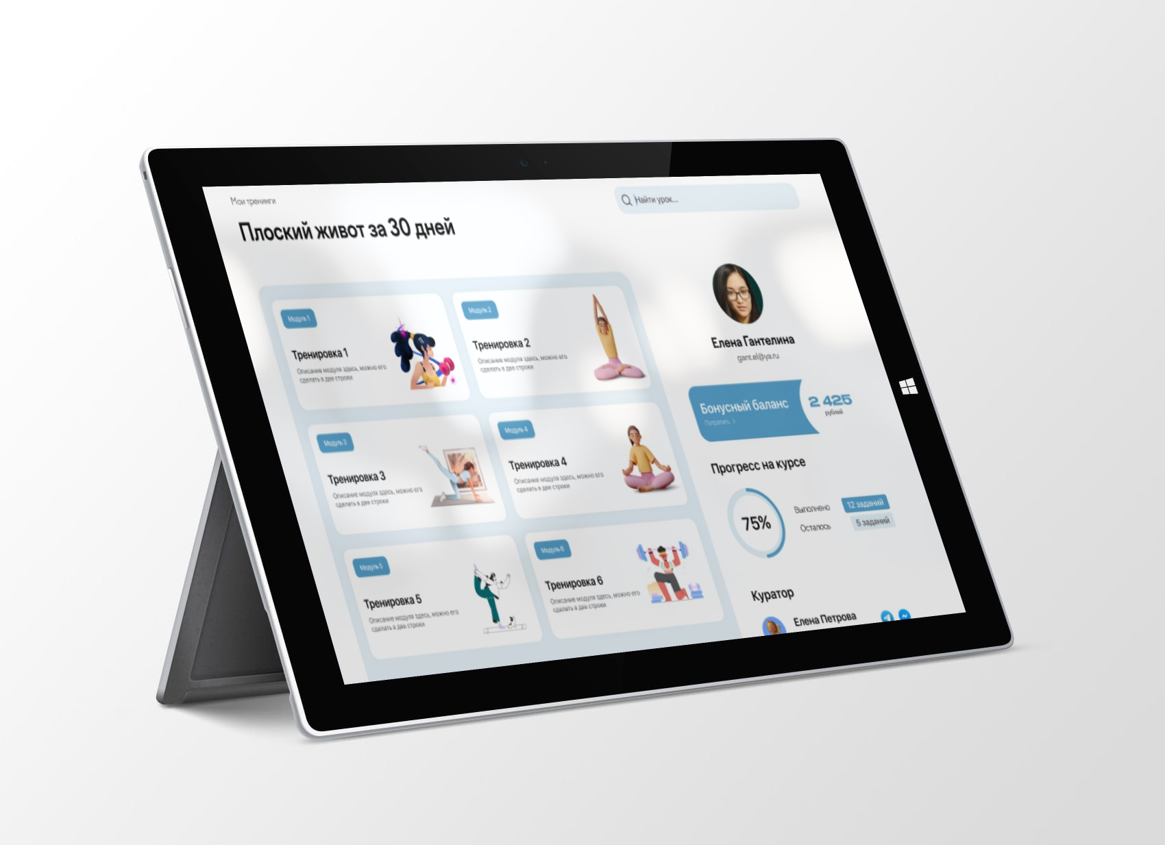 Оформлен аккаунт: левое меню, главная страница тренингов, множество тренингов с уроками