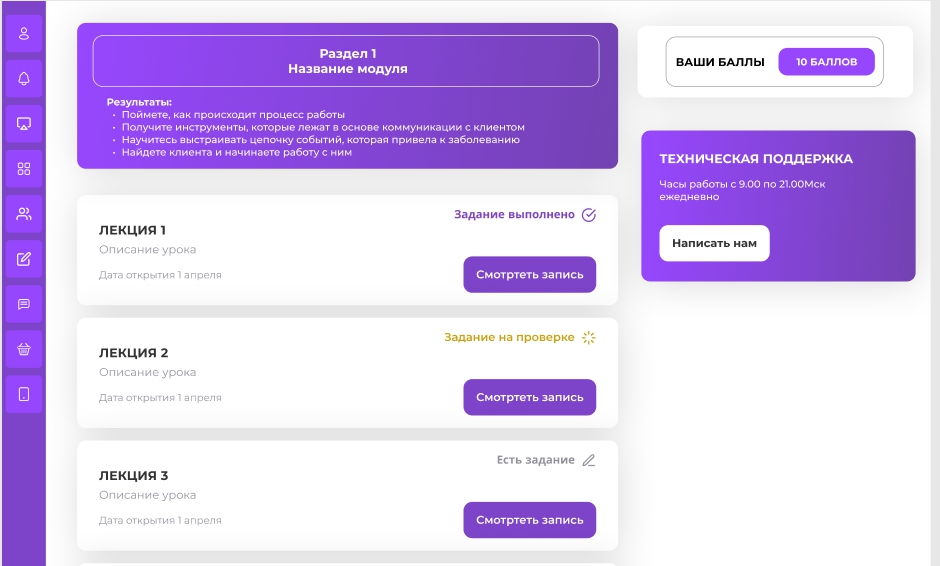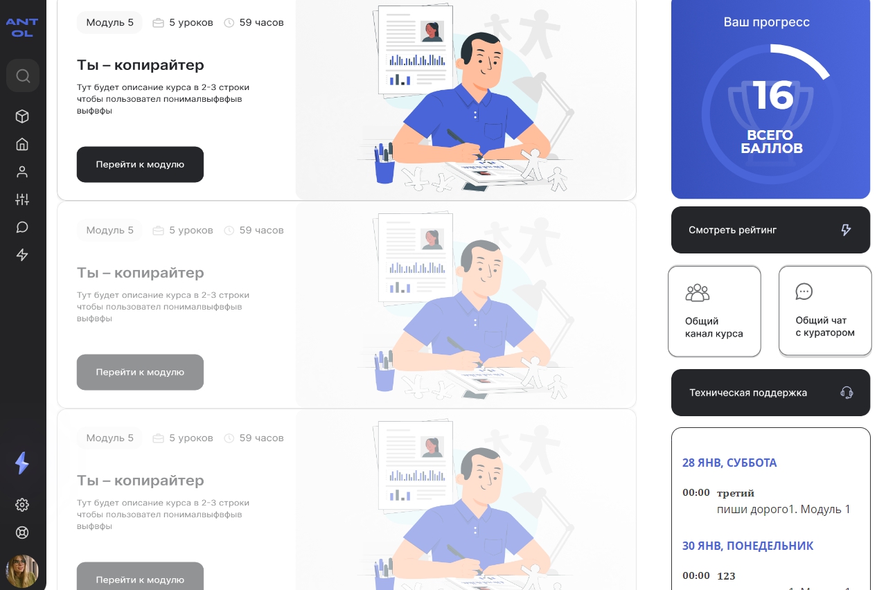 Оформлены страницы курсов, модулей, уроков, изготовлены баннеры в едином стиле, но в разной цветовой гамме, согласно пожеланиям заказчика.