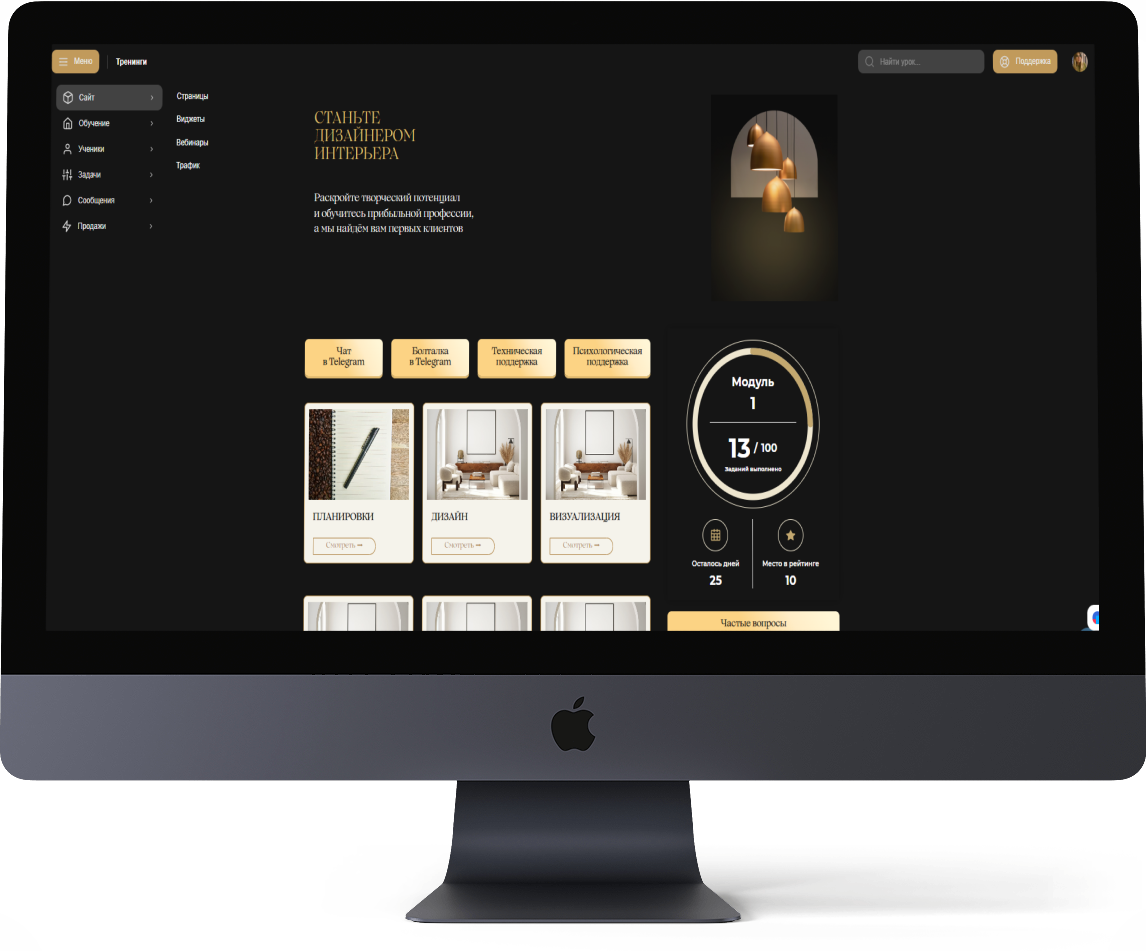 Изменение меню Геткурса (вертикальное, горизонтальное, меню-бургер), страница тренингов, модулей, уроков, вебинарной комнаты, системные страницы (входа, обратной связи, оплаты)